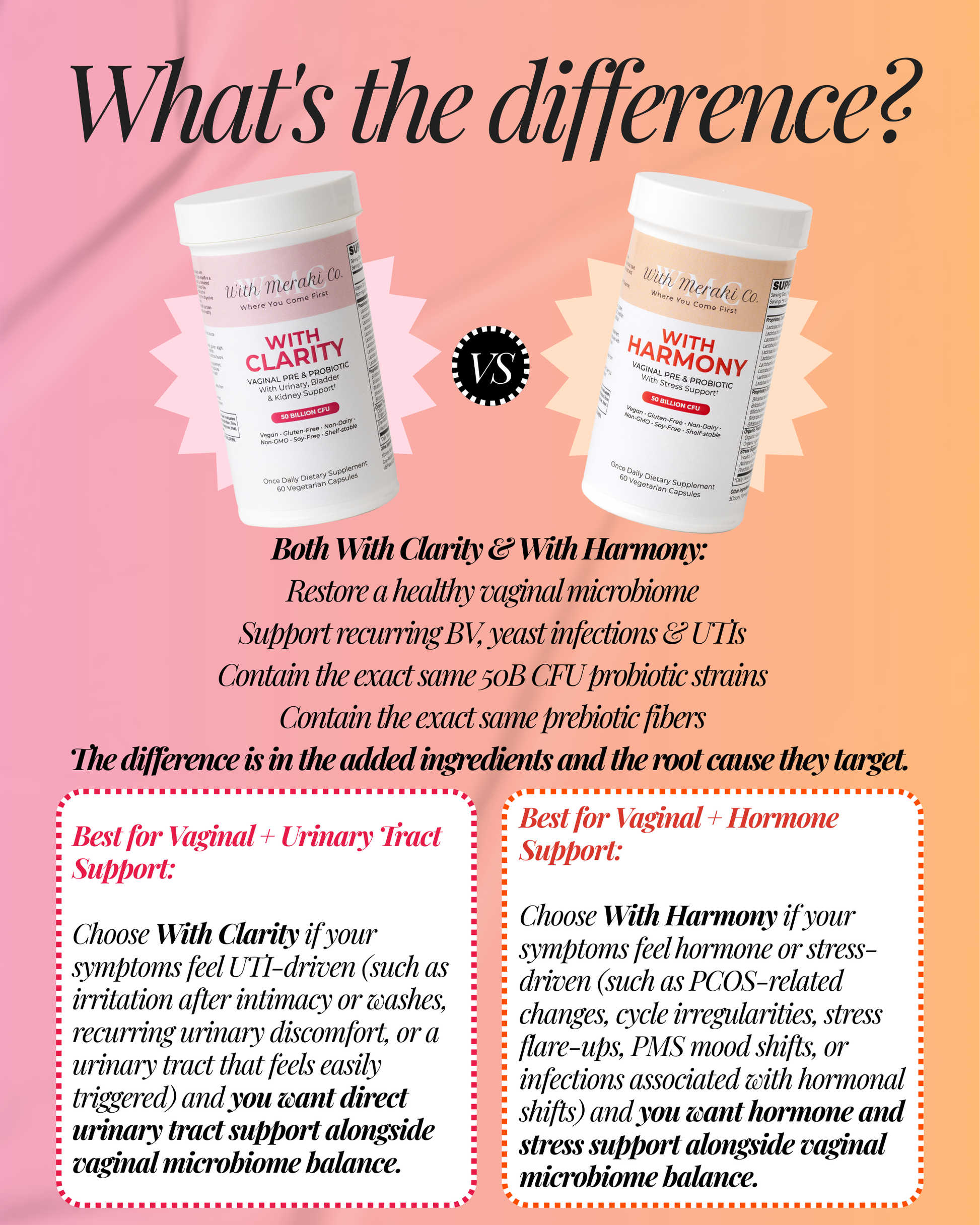 With Harmony Probiotic supports optimal vaginal health by addressing the root cause of hormonal imbalances. Our unique formula combines potent vaginal probiotic strains and prebiotic fibers with a four-ingredient blend of herbs and compounds specifically chosen to target the hormonal fluctuations that often result from menopause, postpartum changes, endometriosis, PCOS, and high stress.